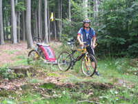 O prodlouženém květnovém víkendu jsme konečně dokončili konstrukci jednoduchého cenově přijatelného odpružení pro Croozer. Cílem nebyla úprava přívěsu pro nějaké extrémní sjezdy nezodpovědných rodičů, ale snaha o zajištění maximálního komfortu pro dítě na běžných cestách mimo silnici. Hned jsme odpružení namontovali a ještě v syrovém stavu (bez povrchové úpravy) vyrazili do terénu. V sobotu jsme nesměle kroužili v lesoparku Divoká Šárka, v neděli jsme zvolili naši oblíbenou trasu z Černolických skal přes Kytín na Stožec a zpět. Náš Kubík (21 měsíců) zvyklý na šestadvacetipalcová kola a komfortní odpružení o zdvihu 10 centimetrů byl v pohodě, během čtyřicetikilometrového výletu obhospodařoval svoje plyšáky, jedl, pil, zkoumal nasbírané šišky, spal a nebo pokřikoval "mámo, táto, pápo".