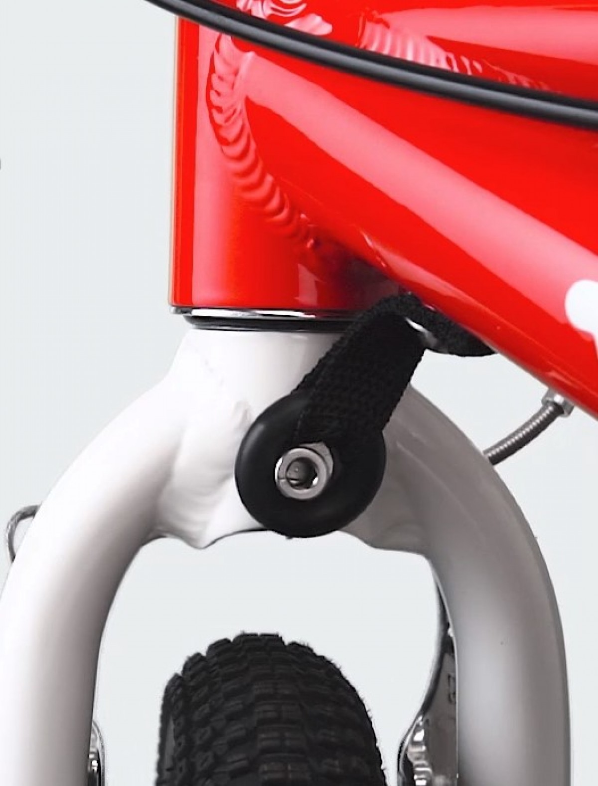 Tohle udělátko  mezi rámem a vidlicí omezuje úhel zatáčení a zamezuje dítěti otočit řídítka do pravého úhlu a následně se katapultovat.